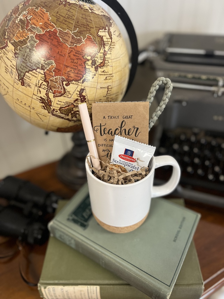 This mug set is for the wonderful lady teachers in your life! A fun pen, mini notebook lettered with a teacher quote, and mini caramel Stroopwafel will come packed in a white travel mug (lid included).